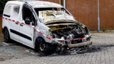 DORDRECHT – In de nacht van donderdag op vrijdag is aan het Bakema erf in Dordrecht een geparkeerde bestelwagen volledig in vlammen opgegaan. De brandweer kreeg rond 05.00 uur melding van de brand en had het vuur snel onder controle. Bij aankomst van de hulpdiensten was de bestelwagen echter al volledig verwoest. Door de hitte liep ook een naast geparkeerde auto schade op. De politie is een onderzoek gestart naar de oorzaak van de brand en houdt rekening met brandstichting. ( Foto’s: Stolk Fotografie / privé )